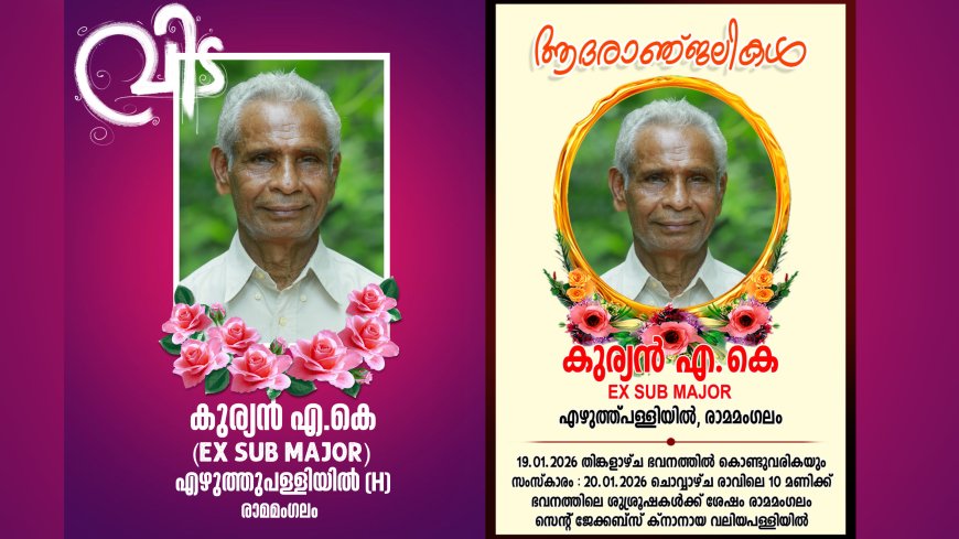 Ex-Subedar Major Kurian A.K passed away and his funeral will be held on Tuesday at Ramamangalam St. Jacob's Knanaya Church.